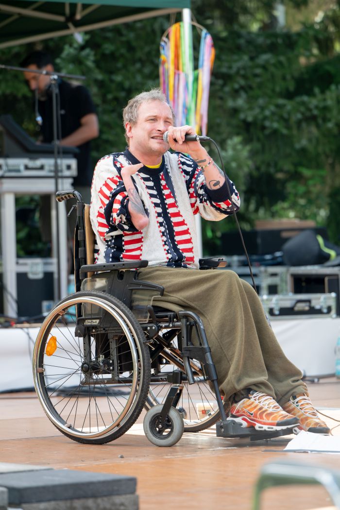 Für eine mitreißende Atmosphäre sorgte bereits die Eröffnung mit unserem inklusiven Stiftungschor „InTakt“, der das erste Mal den neuen Stiftungssong WIR LEBEN ES live performte. Das dazugehörige Musikvideo ist auf der Startseite abrufbar. Viel Applaus bekamen u. a. auch die stiftungseigene Tanzgruppe, der Auftritt des Rappers und Inklusionsbotschafters Graf Fidi und das Berliner Musikkabarett PianLOLA. Die in den Farben des Regenbogens geschmückten Marktstände boten selbst hergestellte Produkte der Tageszentren der Stiftung und anderer sozialer Träger an, die viele begeisterte Käufer*innen fanden. Besonders bei den jungen Gästen sorgten die kostenlosen Mitmachaktionen wie z. B. Kinderschminken, Basteln, Ponyreiten und Rollenrutsche für viel Begeisterung. Bei dem vielfältigen kulinarischen Angebot mit Softeis, Popcorn, Zuckerwatte, Waffeln, Kuchen, Gegrilltem und erfrischende Fruchtcocktails war für alle was dabei.