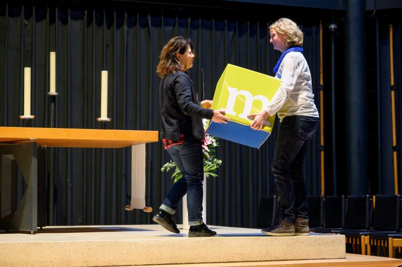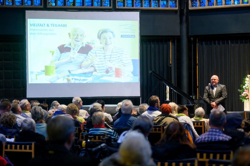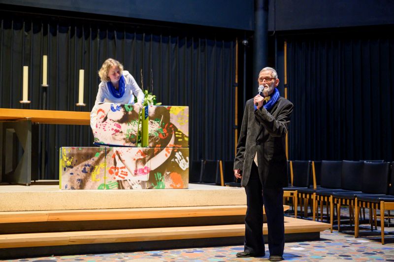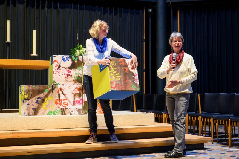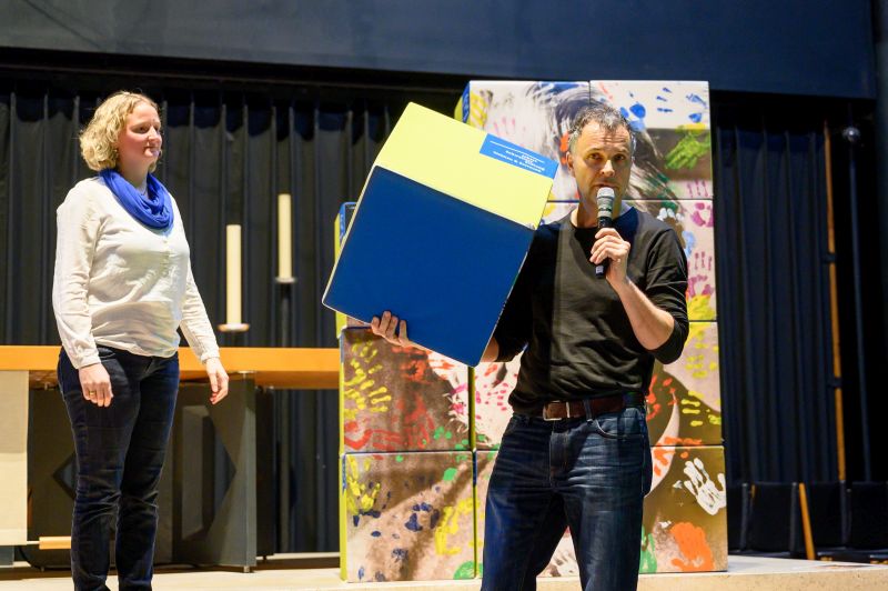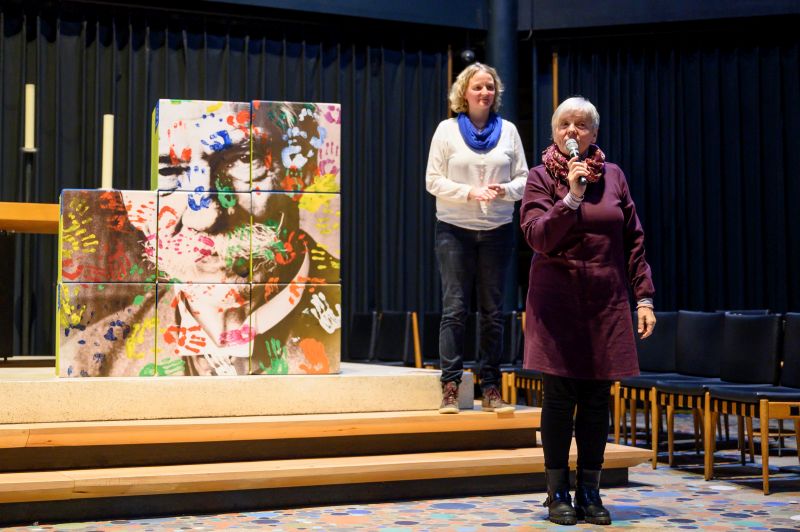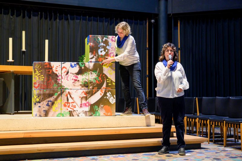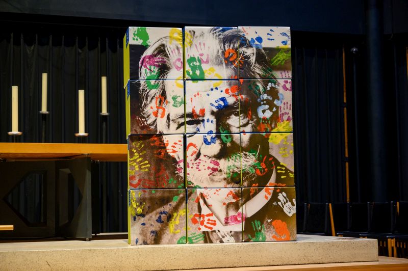 Wie Vielfalt und Teilhabe in der ASS gelebt werden, trugen im Anschluss sechs Menschen, die Angebote der Stiftung nutzen, sowie sechs Mitarbeiter*innen mit kurzen Statements vor, zu denen parallel ein großes dreidimensionales Mosaik mit einem gestalteten Porträt Albert Schweitzers zusammengesetzt wurde.