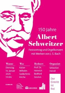 Unter der Überschrift „150 Jahre Albert Schweitzer“ fand am 14. Januar 2024 um 19 Uhr eine Gedenkveranstaltung für Albert Schweitzer in der Kaiser-Wilhelm-Gedächtniskirche statt, die in diesem Jahr von den Albert-Schweitzer-Kinderdörfer und Familienwerke e.V. inhaltlich gestaltet wurde.