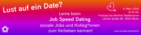 Du willst nicht einfach nur arbeiten, sondern wirklich etwas bewegen? Dann bist du bei uns genau richtig! 12 Berliner Träger der Sozialen Arbeit laden dich ein, beim Job Speed Dating 2025 herauszufinden, wo dein Herz am meisten gebraucht wird.