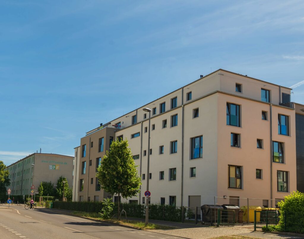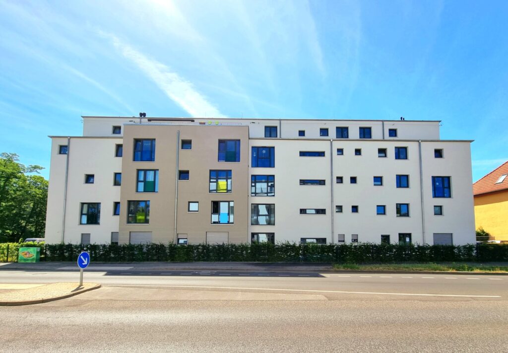 Ganz in der Nähe des Schlossparks mitten im beschaulichen Kiez bieten vier Wohngruppen mit großen Balkonen und offenen, hellen Gemeinschaftsräumen viel Platz für 32 Nutzer*innen mit Assistenzbedarf. Das Dachgeschoss beherbergt eine Wohngemeinschaft, die einen weiten Blick über Niederschönhausen bietet.