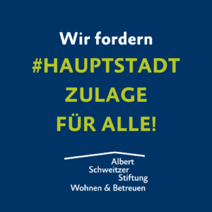 Wir sind über 700 Mitarbeitende, die in der Albert Schweitzer Stiftung – Wohnen & Betreuen jeden Tag mit Engagement und Herz dazu beitragen, dass in Berlin Menschen mit Pflege- oder Assistenzbedarf Zugang zu Teilhabeleistungen erhalten, die ihnen nach dem Bundesteilhabegesetz zustehen. Die jetzt getroffene Aussage des Landes Berlin, dass die tariflich vereinbarte Hauptstadtzulage nur für Beschäftigte des Landes Berlin refinanziert wird und freie Träger wie wir davon ausgenommen sind, widerspricht allen vorangegangenen Zusicherungen. Sie entsetzt uns und zementiert die vom Land Berlin praktizierte Ungleichbehandlung der Beschäftigten in der sozialen Arbeit. Deshalb fordern wir: HAUPTSTADTZULAGE FÜR ALLE!!